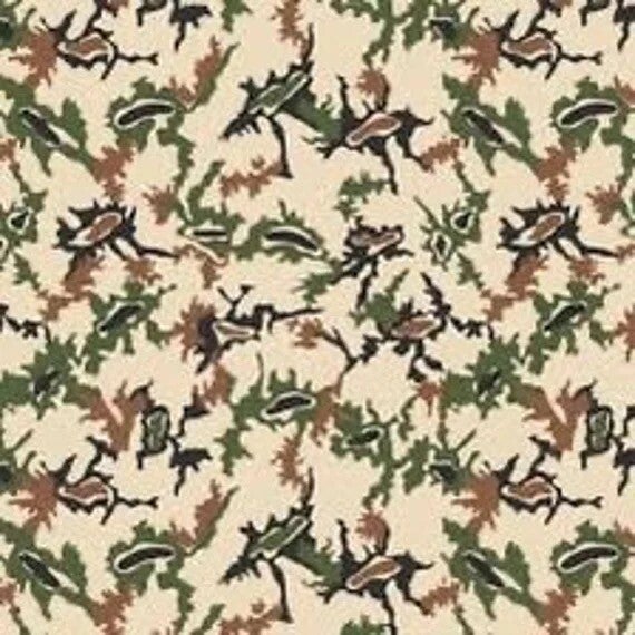 During the Gulf War era, Egyptian forces deployed a distinctive desert camouflage pattern informally nicknamed “Scrambled Egg” due to its rounded, irregular blotches scattered across a tan base. Unlike Western desert patterns of the same period, the Egyptian design used softer, more organic shapes arranged in a loose, non‑repeating layout intended to break up the silhouette in arid terrain, rocky flats, and sandy environments.